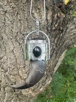 Beautiful Black Bear claw set in Sterling Silver with a onyx stone set on the front and a dark agate stone set on top. Front is Hand stamped with stars and there is a